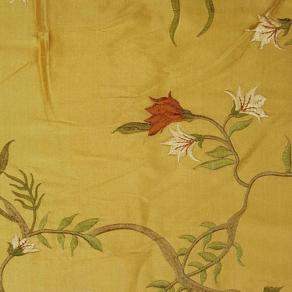EMBROIDERY SILK, 54 INCHES WIDE, 100 PERCENT SILK, EMBROIDERY, APPROXIMATE VERTICAL REPEAT 14.75 INCHES, HORIZONTAL 18 INCHES INDIA SUITABLE FOR DRAPERY AND BEDDING, DRY CLEAN ONLY, SUITABLE FOR DRAPERY & BEDDING.