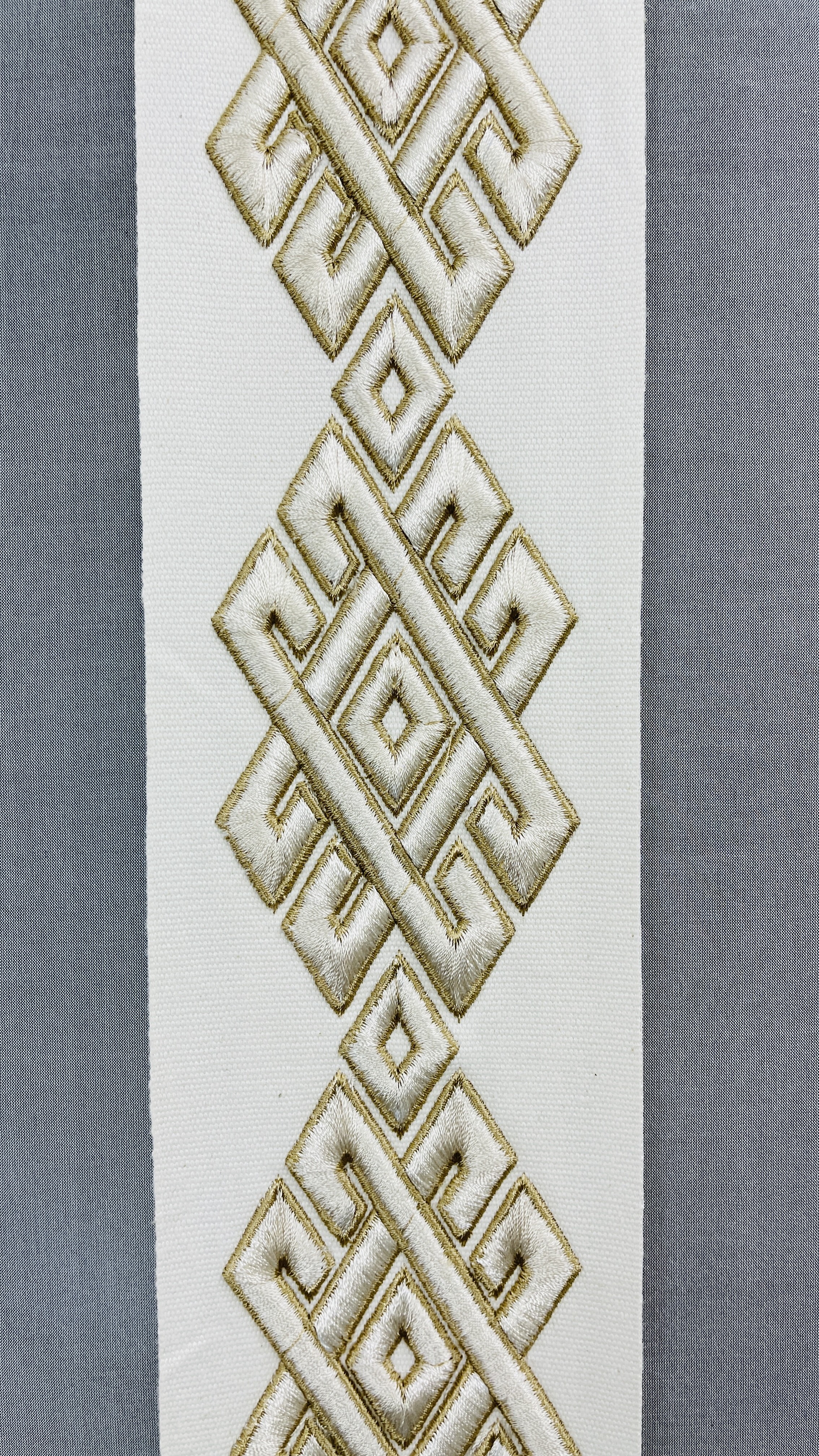 EMBROIDERED TRIM TAPES. COTTON RAYON. DRY CLEAN ONLY.